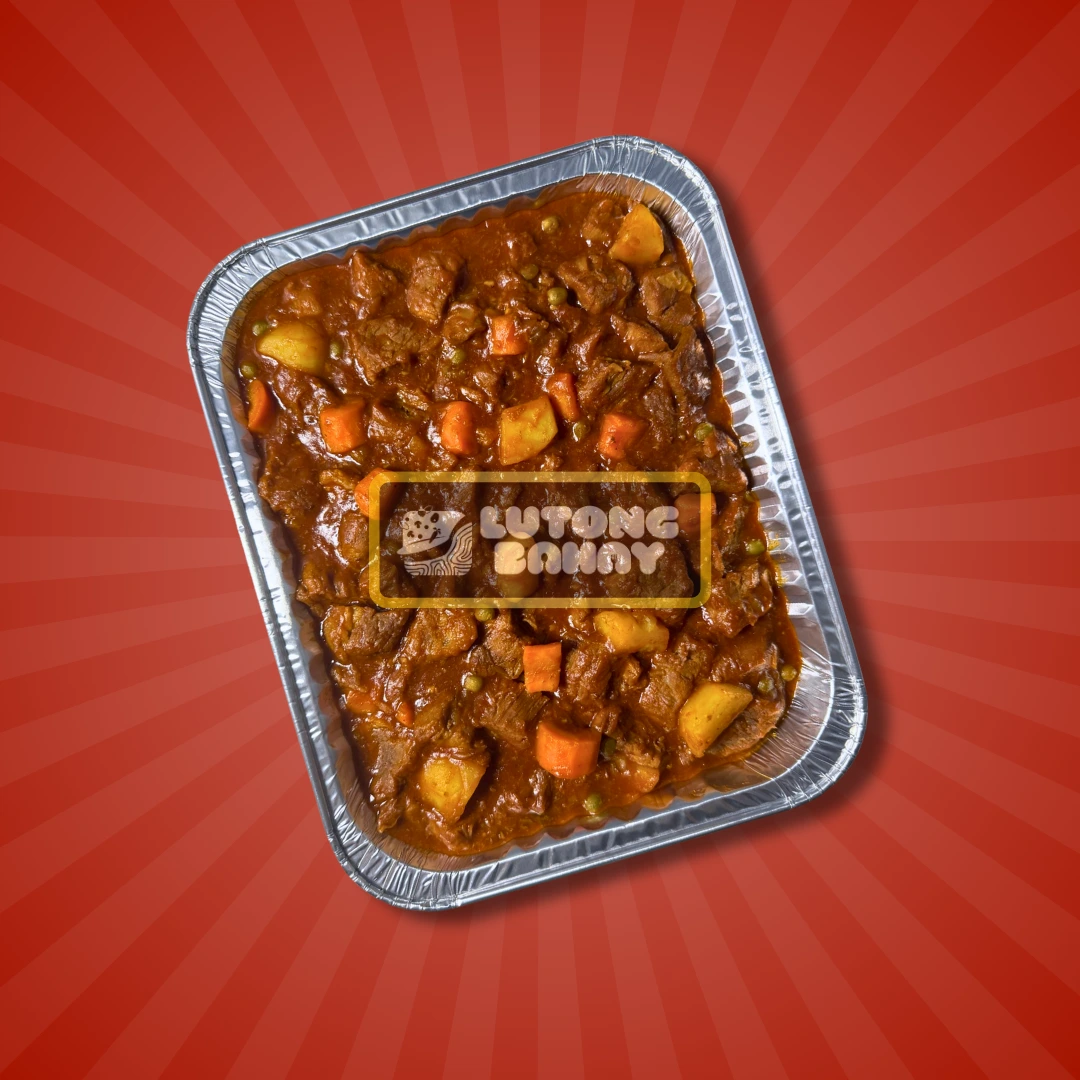 Beef braised in tomato sauce with soy sauce, carrots, potatoes, and bay leaves.